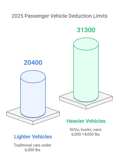 Traditional passenger vehicles face a first‑year deduction cap of $20,400 (2025 estimate, until IRS releases official limits) when used 100% for business. This scales with your business‑use percentage 80% business use means a maximum deduction of $16,320.